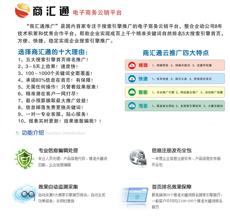 4、首頁排名:客戶的產品信息能快速出現在各大搜索引擎首頁,被潛在客戶瀏覽,在家坐等訂單! 精準搜索:精準關鍵詞帶來精準流量,搜索精準關鍵詞的客戶基本上都是有購買意向的客戶,流量即銷量。